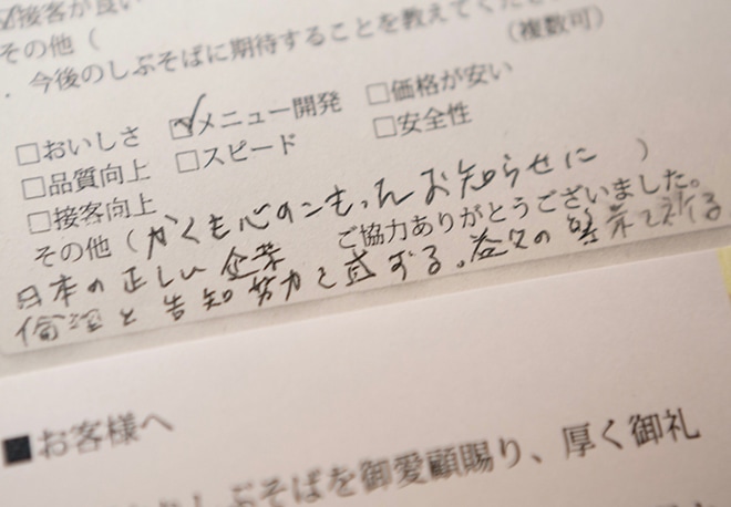 - 価格改定を説明するチラシに付けたアンケートへのお客様からコメント。私たちの想いが、お客様に届いていることを実感し、感動しました。